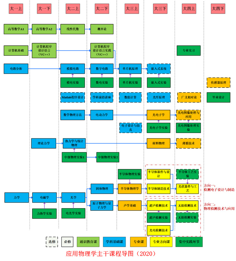 应用物理学专业面向无损检测技术与应用、检测电子设计与制造等技术领域培养具备扎实理论基础和丰富实践经验的复合型人才。该专业开设普通物理、电磁学、光学、数学物理方法、固体物理、半导体物理学、计算物理、材料物理、无损检测概论、半导体工艺、光伏器件与工艺、光电子学、材料分析检测技术、光电检测技术、电路分析、模拟电路、数字电路、信号与系统、单片机原理、嵌入式系统、计算机网络等专业理论和课程。
