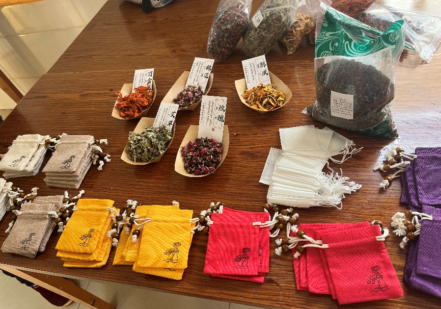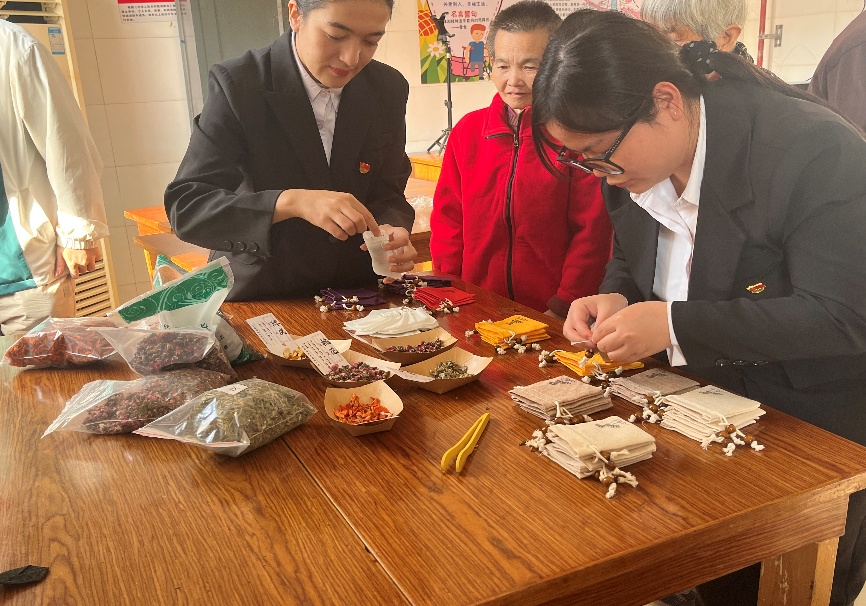 “茱萸香囊寄安康”活动也在温馨氛围中展开。民间素有“重阳插茱萸,簪菊花,避邪求吉”的说法,茱萸性温、味辛微苦,能温中止痛、祛湿散寒,正合秋冬交替的养生所需。支部党员提前准备了茱萸、艾草、桃花、百合、玫瑰、橘皮等多种香料,一字排开宛若“香料小集市”。老人们兴致勃勃地挑选心仪的配料,党员们则陪伴左右,协助装袋、封口,共同完成一个个专属香囊。淡淡的药香在指尖流转,五彩缤纷的香囊很快摆满桌面,药香与笑语交织,溢满长廊。